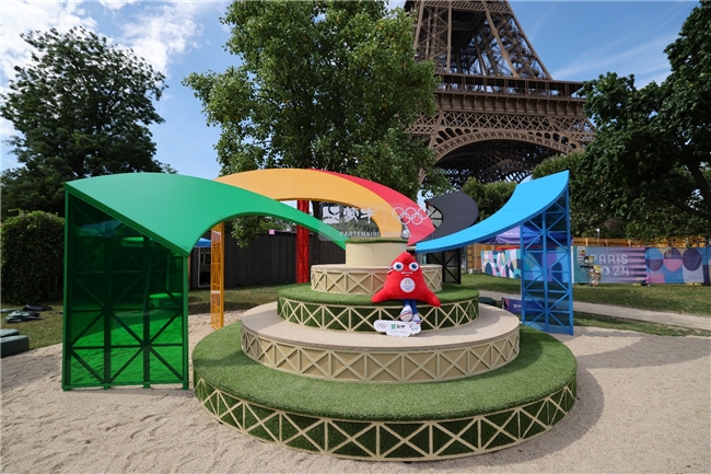 2024年巴黎奥运期间,蒙牛将乌兰布和沙漠的绿化成果带到巴黎。在埃菲尔铁塔体育场里,蒙牛打造了一块140平方米的沙漠绿洲休闲区,代表着内蒙古自治区乌兰布和沙漠和绿洲牧场,呼吁更多人加入绿色行列。