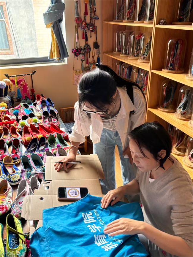 2026年4月27日下午13:00,“嵩明汉绣,创承锦绣”实践团队前往嵩明县汉族刺绣传习馆,与非遗传承人携手开展非遗创新合作,用传统刺绣技艺为校园定制特色标识。
